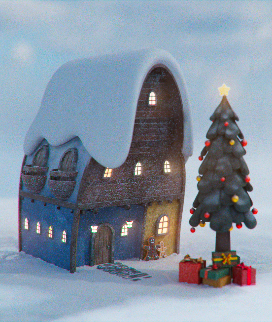 These are two close-up images showcasing all the details of the shots. The snow was created using texture, with some elements made using a volume builder and X-Particles
